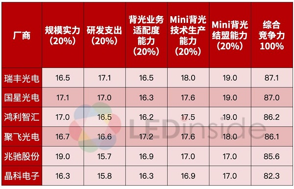 注:規(guī)模實(shí)力主要考核廠商的整體規(guī)模,主要包括營收規(guī)模和人員規(guī)模,這關(guān)系到企業(yè)承擔(dān)風(fēng)險(xiǎn)的能力以及后期持續(xù)投資的能力;研發(fā)支出主要考核企業(yè)的研發(fā)支出與營收比,比較企業(yè)對技術(shù)研發(fā)的重視程度;業(yè)務(wù)適配度能力主要考核企業(yè)的原有業(yè)務(wù)與mini LED業(yè)務(wù)的適配性,是否更利于客戶的開發(fā)與合作;技術(shù)生產(chǎn)能力主要考核企業(yè)的技術(shù)和產(chǎn)能實(shí)力;結(jié)盟能力主要考核目前企業(yè)與上下游產(chǎn)業(yè)鏈的合作情況,合作對象的實(shí)力情況。