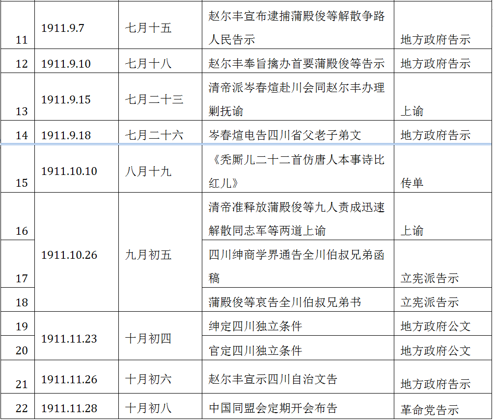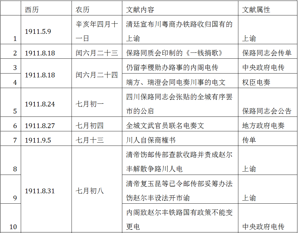 李劼人的《大波》是當時為數(shù)不多的在小說中鄭重開列和鋪排爭路運動史料的長篇小說。統(tǒng)計后會發(fā)現(xiàn),其所“引用”的與運動相關(guān)的文獻一共22筆,絕大多數(shù)屬全文“引用”,其中一部分第一手資料亦被史學(xué)界使用:[7]