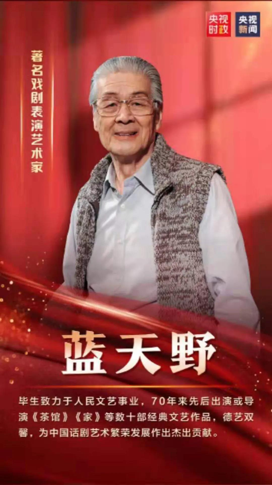6月29日,慶祝中國共產(chǎn)黨成立100周年“七一勛章”頒授儀式在北京人民大會堂隆重舉行,94歲的藍(lán)天野獲頒“七一勛章”。70年來,藍(lán)天野出演及導(dǎo)演了大量文藝作品。尤其是在北京人藝那些具有民族化、寫意化風(fēng)格的古裝劇中,他的表演有著十分獨(dú)特的韻味。他在話劇及電影《茶館》中飾演的秦仲義、話劇《蔡文姬》中飾演的董祀、話劇《王昭君》中飾演的呼韓邪等人物,成為其他演員迄今難以超越的形象。他在電視劇《渴望》和《封神榜》中飾演的王子濤和姜子牙的熒幕形象在觀眾中更是膾炙人口。繼2011年84歲高齡重返北京人藝舞臺,演出經(jīng)典劇目《家》之后,2012年,北京人藝建院60周年,藍(lán)天野出演了原創(chuàng)大戲《甲子園》中的男一號黃仿吾,與諸多人藝高齡老藝術(shù)家一起創(chuàng)造了中國話劇史上的又一奇跡。2018年,藍(lán)天野為北京人藝執(zhí)導(dǎo)了新創(chuàng)話劇《大訟師》,2020年,93歲的藍(lán)天野在北京人藝68周年院慶晚會上的《蔡文姬》片段中再度飾演了董祀一角,成為話劇舞臺上的一段佳話。