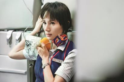 看過袁泉《中國機(jī)長(zhǎng)》中的表演,就能理解文婷醫(yī)生的成功塑造并非偶然。乘務(wù)長(zhǎng)畢男形象的確立不僅僅依靠前文提到的她蘊(yùn)含豐富情緒的雙眼,更是她對(duì)角色整體的塑造。畢男在面對(duì)乘客時(shí)立即呈現(xiàn)空乘人員的職業(yè)姿態(tài),回到操作間與同事吐槽時(shí)放松的姿態(tài),以及機(jī)艙內(nèi)突發(fā)釋壓的情況下,她衣著和妝發(fā)因巨大氣流沖擊而凌亂,但表情和身體迅速恢復(fù)職業(yè)姿態(tài)冷靜安撫乘客。一次一次為核實(shí)同事安全和安撫乘客,畢男冒著生命危險(xiǎn)摘下氧氣面罩,盡量克制自己的恐懼,極力保持專業(yè)的狀態(tài)。袁泉的表情、微表情、身體的姿態(tài)都傳達(dá)出角色極度緊張,有細(xì)微的躊躇但又迅速冷靜的內(nèi)心變化。這一系列情境轉(zhuǎn)變中角色的表演完全隨著影片敘事而行進(jìn),看似行云流水,卻是演員常年自律和勤奮的體現(xiàn)。