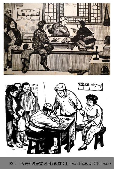 根據(jù)農(nóng)民的意見,古元借鑒了民間木刻年畫以陽刻為主的技法傳統(tǒng),將西洋木刻的黑白趣味轉(zhuǎn)向明快的單線,也吸收了傳統(tǒng)復(fù)制木刻、民間繪畫和裝飾藝術(shù)中喜慶凡俗的情感風(fēng)格。已有研究大多強(qiáng)調(diào)古元的木刻風(fēng)格在這一時期發(fā)生的“急速轉(zhuǎn)變”:他重刻了1941年創(chuàng)作的《哥哥的假期》《結(jié)婚登記》《離婚訴》三幅頗有影響的作品,其中“重刻的《哥哥的假期》保持了畫面原有的構(gòu)圖和人物形象,只是在刀刻技法上,更多采用了‘陽刻’的方式,減弱光影層次變化,使畫面明亮起來。《結(jié)婚登記》和《離婚訴》則是重新構(gòu)圖,重新安排人物形象,原作與新作相比在技巧和風(fēng)格上完全是兩樣。在這兩幅新作中,古元減弱了背景空間的描繪,以人物為中心,突出畫面的故事性和情節(jié)性,在技法和風(fēng)格上,由塊面的光影層次向線條塑造轉(zhuǎn)變,由多種繁復(fù)的陰刻刀法向單純簡練的陽刻刀法轉(zhuǎn)變”。然而需要辨析的是,這一轉(zhuǎn)變其實并沒有中斷古元在碾莊下鄉(xiāng)時就已形成的那些核心的形式機(jī)制,反而在敘事性、生活細(xì)節(jié)、對新情感的發(fā)現(xiàn)等關(guān)鍵點上延續(xù)甚至強(qiáng)化了這些經(jīng)驗。古元進(jìn)行修改重刻的底本,選取的都是一些本身就具有敘事性,能夠表現(xiàn)農(nóng)民生活中的新事物、新風(fēng)俗、新情感的作品。更重要的是,古元創(chuàng)作中豐富的細(xì)節(jié)并沒有因線條和刀法的簡化而減少,反而能夠在刪繁就簡中提煉出更具有典型性的形象和道具進(jìn)行重組。換言之,線條的減少并不意味著生活內(nèi)容的縮水或表現(xiàn)力度的降低。例如在對《結(jié)婚登記》(見圖2)的修改中,雖然極大地削減了對空間場景(鄉(xiāng)政府辦公室)的描繪,卻通過對道具的提煉(信插、文件)明確地標(biāo)示出了人物所處的環(huán)境,而人物表情和姿態(tài)的豐富化、對人物關(guān)系的重新搭建,都顯示出一種更加明確化與精細(xì)化的調(diào)整,以及對“內(nèi)容真實”的重視。