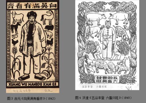 1944年隨中外記者團(tuán)訪問延安的英國記者G.斯坦因曾專訪過吳滿有,但據(jù)胡一川日記的記載,當(dāng)周揚將古元的木刻年畫《向吳滿有看齊》拿給斯坦因看并問他像不像時,斯坦因卻搖搖頭表示不像。此外,作家蕭軍在1943年12月27日參加延安的勞動英雄選舉大會時,也曾在日記中記錄下他對吳滿有的印象:“吳滿有中等身材,面貌顯得機(jī)智,靈秀,動作輕便,不像一般畫像與刻像那般沉重、蒼老?!痹谏鲜瞿欠究棠戤嬛?,古元不止一次刻畫過吳滿有的形象。例如1942年8月13日的《解放日報》在刊登柯藍(lán)的人物特寫《吳滿有的故事》時,配圖就是古元為吳滿有刻制的一幅木刻肖像。蕭軍的這一印象顯然不同于這幅木刻肖像中滿臉滄桑的吳滿有形象。與現(xiàn)存的吳滿有的攝影形象比較來看,古元創(chuàng)作的木刻肖像突出了人物臉部層層疊疊的皺紋,木刻年畫中的吳滿有則高大挺拔,面相敦厚和藹,周身圍繞著豐收的莊稼與豐富的牲畜,作為裝飾性的圖案。與蕭軍的實感相比,這些木刻形象突出的是吳滿有的質(zhì)樸、勤勞以及命運巨變的滄桑印痕。沃渣1940年時曾創(chuàng)作過一幅題為《五谷豐登 六畜興旺》(見圖4)的木刻年畫,已使用過類似的構(gòu)圖和農(nóng)民形象,但古元年畫中的吳滿有增大了人物比例,更加突出了勞動英雄的中心位置。與沃渣畫中衣著簡單、頭扎手巾、并攏雙腳略顯拘謹(jǐn)?shù)霓r(nóng)民形象相比,古元畫中的吳滿有則頭戴厚絨帽、身穿一件翻出毛領(lǐng)的新皮襖,雙腿分開穩(wěn)穩(wěn)站立,既顯示出生活的富足,又透露出一種自信穩(wěn)健的精神狀態(tài)。從斯坦因訪談吳滿有的描述來看,這與“穿著普通的工作服”“身體結(jié)實,堅決而誠實的面孔,和善的笑容,眼神聰明和藹,典型的中國農(nóng)民”的形象相比,或許存在外形上的差別,但實際上是基于相似的精神面貌做出了提升。換言之,比之于“形似”,古元可能更注重捕捉這種“神似”的真實性。與沃渣畫中的普通農(nóng)民相比,古元畫中的吳滿有則更能代表邊區(qū)通過革命翻身、生產(chǎn)致富的新農(nóng)民形象,這也更符合在大生產(chǎn)運動中應(yīng)運而生的“吳滿有運動”這一典型政治的內(nèi)在訴求。