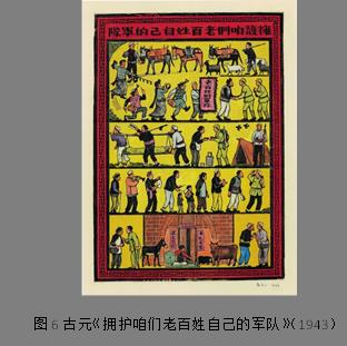在1942到1943年間,除了灶君畫的形式,古元還借鑒過多種民間年畫的格式。1943年創(chuàng)作的套色版畫《講究衛(wèi)生》《人興財旺》(見圖5)融合了對開鏡像式的“門畫”構(gòu)圖與“麒麟送子”的圖式,用抱著谷子、麥穗的邊區(qū)兒童取代了傳統(tǒng)年畫中懷抱幼兒的童子形象。男童手持紅纓槍,女童手托白棉線,各自斜挎的背包上綴著紅五星,圖像頂部荷花圖樣團(tuán)簇著紅色綢帶,分別書寫著“講究衛(wèi)生”與“人興財旺”的字樣,將邊區(qū)的衛(wèi)生運動、識字運動、婦紡運動、生產(chǎn)與戰(zhàn)斗相結(jié)合等新生活、新民俗的元素都融合進(jìn)了畫面當(dāng)中。而鮮艷明朗的套色,健康、喜慶的新兒童形象與“麒麟送子”圖式的結(jié)合,又迎合了老百姓對于紅火、吉利、人丁興旺等美好寓意的向往。同年,古元還借鑒鳳翔年畫《紡織圖》的構(gòu)圖形式創(chuàng)作了套色木刻《擁護(hù)咱們老百姓自己的軍隊》(見圖6),以一種全景敘事的方式,將畫面劃分為幾個彼此關(guān)聯(lián)的水平空間,把老百姓趕著牛羊、扭著秧歌慰勞軍隊、轉(zhuǎn)移傷員、為戰(zhàn)士送飯、歡送子弟當(dāng)兵、幫助抗屬建立家務(wù)等多個空間情景并置在一幅畫面當(dāng)中。整幅木刻精心刻畫了32個姿態(tài)神情各不相同的人物形象,充斥著各種富含情感性的細(xì)節(jié),例如慰勞部隊時老農(nóng)與戰(zhàn)士緊握的雙手,守衛(wèi)村莊的戰(zhàn)士微笑著正要接過大娘送來的飯食的瞬間,百姓和戰(zhàn)士下意識地靠近彼此的身體姿態(tài),都蘊含著一種軍民之間彼此親近、信任的情感關(guān)系;而為保衛(wèi)村莊安扎的帳篷、擔(dān)架上的傷員以及最下方圖像中失去一條腿的軍人,則以一種細(xì)膩的方式傳達(dá)出軍隊為保衛(wèi)群眾和村莊付出的血淚與犧牲。由此,古元將旨在指導(dǎo)邊區(qū)群眾如何“擁軍”這一單向的政治教育,轉(zhuǎn)化為了一種“軍愛民”“民擁軍”,百姓與軍隊之間雙向互動的情感過程與血肉聯(lián)系,具有一種“動之以情、曉之以理”的感染力與說服力。
