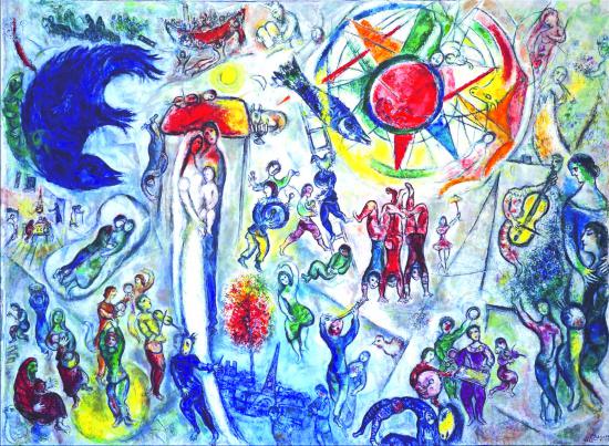 自1966年起直至1985年,夏加爾在法國普羅旺斯的圣保羅-德-旺斯鎮(zhèn)安家,創(chuàng)作了大量以當(dāng)?shù)匦沱惥爸聻樵慈囊耙莓?,成為法國的“蔚藍(lán)海岸派”畫家。他的畫作曾兩度在中國展出,得到中國觀眾的喜愛。早在1978年,筆者初次到巴黎就接觸到他的繪畫作品,看見街頭報(bào)亭里擺著他的曼妙畫幅《雅各的夢》和《埃菲爾鐵塔的新婚夫婦》,而后又在尼斯和艾克斯參觀了他的繪畫展覽。還值得提及,巴黎大歌劇院穹頂中心的彩繪天花板是馬爾羅于上世紀(jì)60年代初特邀請夏加爾設(shè)計(jì)的,上面畫有《火鳥》《天鵝湖》和《魔笛》等著名舞劇的圖像。他曾為《雅各的天梯》一畫配詩,作為給自己繪事生涯的歸結(jié):