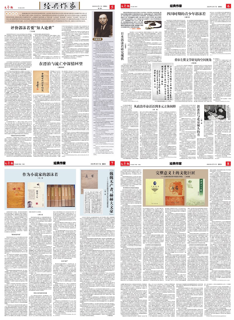 郭沫若是我國杰出的文學(xué)家、歷史學(xué)家、文字學(xué)家、社會(huì)活動(dòng)家,曾任政務(wù)院副總理兼文化教育委員會(huì)主任、全國政協(xié)副主席、中國科學(xué)院院長、中國文聯(lián)主席、中國科學(xué)技術(shù)大學(xué)校長等。在中國現(xiàn)當(dāng)代文學(xué)文化史進(jìn)程中,他廣泛涉獵新詩、戲劇、小說、散文、歷史學(xué)、文字學(xué)、考古學(xué)等各個(gè)領(lǐng)域并均有所建樹,又以廣闊的社會(huì)歷史視野介入到文學(xué)的思想運(yùn)動(dòng)之中。本期著眼于四川、日本、上海、重慶、北京等郭沫若生活、學(xué)習(xí)、工作、寫作的地理空間和文化場(chǎng)域,對(duì)相關(guān)研究成果進(jìn)行簡要的學(xué)術(shù)梳理,感謝廖久明先生在組稿和策劃方面所做的貢獻(xiàn)。