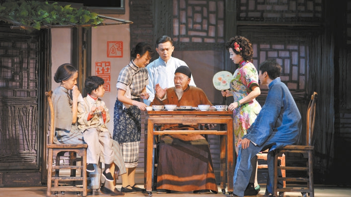 其實,三卷本長篇小說《四世同堂》作為老舍“從事寫作以來最長的,可能也是最好的一本書”,規(guī)模龐大、結構復雜、人物繁多,問世以來一直被話劇界敬而遠之。雖然改編難度顯而易見,但這也激起了李東的挑戰(zhàn)欲:“這個改編的門檻一旦越過去以后,你就把別人擋在外面了?!背松頌楸本┤藢仙嵛淖值奶厥馇楦校蔡寡?,制作《四世同堂》還有更重要的考量,就是希望能通過做一部戲來向《茶館》致敬,同時也是想在這個過程中探索京味兒戲在創(chuàng)作上更多的可能性。