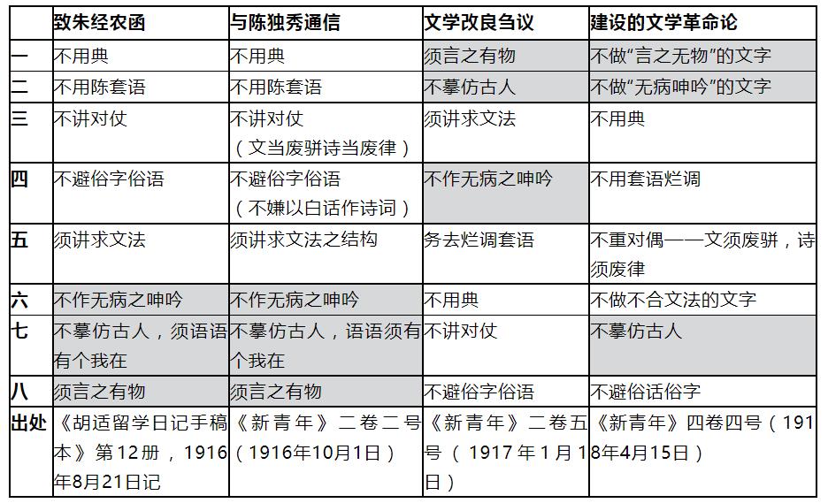 胡適在《新青年》上發(fā)表《文學(xué)改良芻議》,一向被敘述為文學(xué)革命的起點(diǎn),其中最為核心的就是“八事”。有關(guān)“八事”,胡適前后有好幾個(gè)版本。按他自己的說法,最早于1916年8月19日給朱經(jīng)農(nóng)的函件中提出,[5]隨即10月的《新青年》第二卷第二號(hào)上刊載他給陳獨(dú)秀的“通信”,也有同一版本的“八事”,只是稍多些附注。估算郵寄到刊發(fā)的時(shí)間,應(yīng)寫于給朱經(jīng)農(nóng)信后不幾天。接著就是《文學(xué)改良芻議》上的版本,內(nèi)容未變,順序卻進(jìn)行了很大的調(diào)整。到《建設(shè)的文學(xué)革命論》,除又有順序調(diào)整外,為了映照新提出“肯定的口氣”的“四條”,“八事”均改寫為以“不”開頭的句式。為清眉目,茲先簡(jiǎn)表如次: