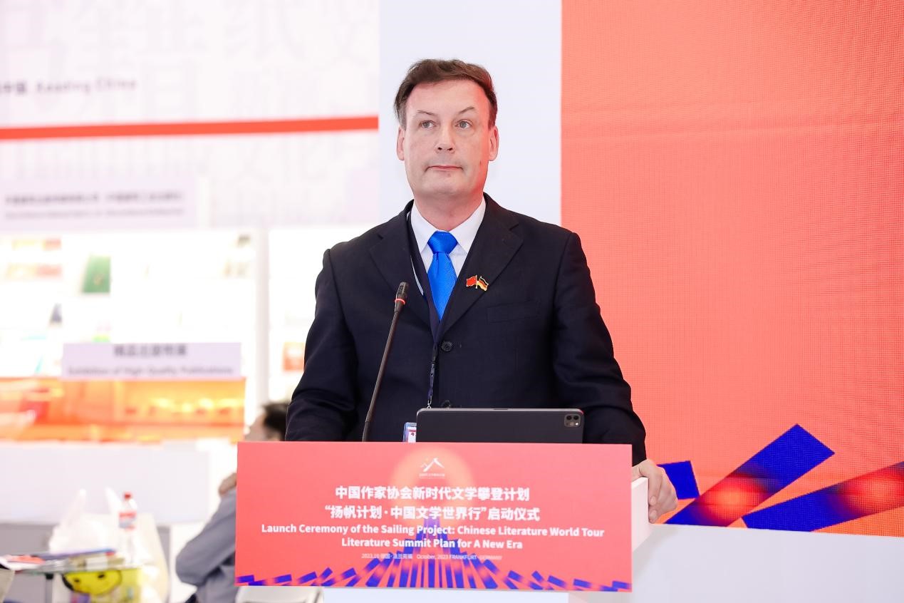 10月19日,在法蘭克福舉行的“新時代文學攀登計劃·揚帆計劃”之“中國文學世界行”啟動儀式暨圖書版權簽約儀式上,來自中外的出版人和作家匯聚一堂,打造中國作家海外傳播集群,促進形成中國文學圖書版權輸出矩陣,講好中國故事,讓海外通過中國當代文學了解可信、可愛、可敬的中國形象,推動中國文化更好地走向世界?;顒蝇F(xiàn)場,法蘭克福書展副主席柯樂迪,中國駐法蘭克福總領館總領事黃昳揚,中國作家協(xié)會副主席李敬澤,中宣部出版局局長馮士新,中國作家協(xié)會創(chuàng)研部主任何向陽,中國出版集團有限公司黨組成員、中國出版?zhèn)髅焦煞萦邢薰靖笨偨?jīng)理張紀臣,中國圖書進出口(集團)有限公司總經(jīng)理林麗穎共同啟動 “新時代文學攀登計劃·揚帆計劃”之“中國文學世界行”項目。