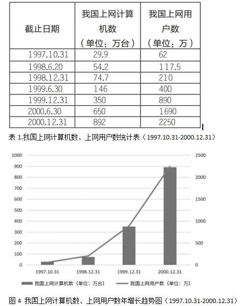 此外,來(lái)自官方的調(diào)查報(bào)告,雖選用了不同的調(diào)查指標(biāo),但其呈現(xiàn)的互聯(lián)網(wǎng)發(fā)展趨勢(shì),與上述兩種“民調(diào)”結(jié)果大致相符。中國(guó)互聯(lián)網(wǎng)絡(luò)信息中心(CNNIC)自1997年12月1日發(fā)布《第一次中國(guó)互聯(lián)網(wǎng)絡(luò)發(fā)展?fàn)顩r調(diào)查統(tǒng)計(jì)報(bào)告》起,以每年1-2次的頻率發(fā)布的中國(guó)互聯(lián)網(wǎng)絡(luò)發(fā)展?fàn)顩r調(diào)查統(tǒng)計(jì)報(bào)告顯示,大約在同一時(shí)期,我國(guó)上網(wǎng)計(jì)算機(jī)數(shù)和上網(wǎng)用戶數(shù)均實(shí)現(xiàn)了大幅增長(zhǎng)(如下表1、圖4所示,其中所有原始數(shù)據(jù),均抽取自這一官方調(diào)查報(bào)告,即第1-7次調(diào)查統(tǒng)計(jì)報(bào)告),據(jù)此亦可核算出此時(shí)我國(guó)上網(wǎng)計(jì)算機(jī)數(shù)的年平均增長(zhǎng)率為32.24%,上網(wǎng)用戶數(shù)的年平均增長(zhǎng)率為30.2%30: