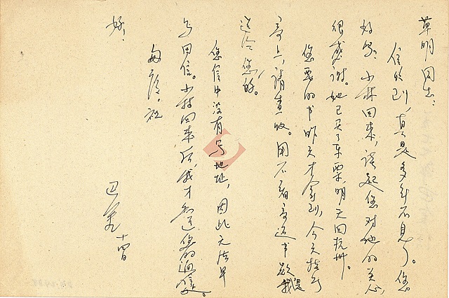 “今天看到小林了,十分高興!十幾年未見,她已長大成人了。并且已做了母親,工作也好多年了。她對我還是那么親熱,很談得來。從她那兒,了解了上海文藝界一些熟人的情況,也了解了你們家的一些情況。是的,十多年來,彼此的變化是很大的。總的說來,我們老一代的,長了不少見識,也可以說路線斗爭的覺悟提高了??偹憧吹搅直搿⑺娜藥湍切┖趲偷母矞?;也看見一些敗類一個一個地露出尾巴來!勝利是永遠屬于人民的??!我們文藝工作者生活在這樣偉大的時代,目睹人民(也包括我們自己)的多次歷史性的斗爭的勝利,應(yīng)該自豪,應(yīng)該為我們英雄的人民大唱贊歌啊。是不是這樣哩?寫吧,同志。