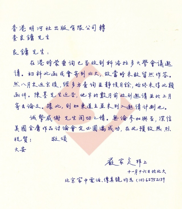 一九九七年十一月十六日,嚴家炎先生與金庸先生的通信 中國現(xiàn)代文學館供圖