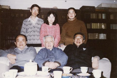 王瑤和學(xué)生們的合影:前排左起依次為錢(qián)理群、王瑤、吳福輝,后排左起依次為陳平原、張玫珊、溫儒敏