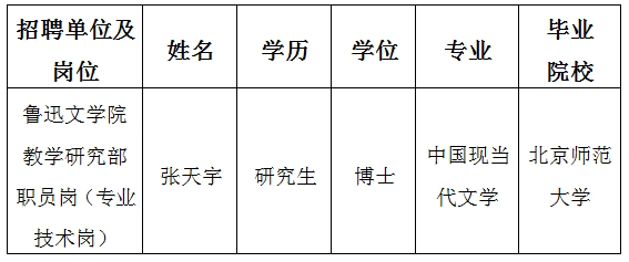 因魯迅文學(xué)院教學(xué)研究部職員崗擬聘人員武茳虹自愿放棄聘用資格,根據(jù)公開招聘工作有關(guān)規(guī)定,遞補(bǔ)張?zhí)煊顬樵搷徫粩M聘人員,現(xiàn)予以公示。公示期間,如有問題,請直接向我單位反映,或通過中央和國家機(jī)關(guān)所屬事業(yè)單位公開招聘服務(wù)平臺反映。