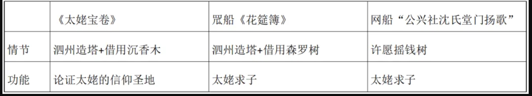 但在諸多網(wǎng)船堂門的揚(yáng)歌中,這一單元極少出現(xiàn),筆者只在“公興社沈氏堂門揚(yáng)歌”中發(fā)現(xiàn)一點(diǎn)痕跡,太姥夫婦去向泗洲佛求子,看見泗洲佛的廟宇神像極為破敗,于是許下重愿:“我鋸脫搖錢樹做身段,頭段送到新場成學(xué)寺,二段送到普陀洛迦山,第三段送你四(泗)洲老佛做金身,金肚子來銀肚腸……”后來果然如愿得子。這里的搖錢樹,從名物和功能上似乎等于罛船揚(yáng)歌中的森羅樹,但完全丟棄了泗州鎮(zhèn)妖的敘事情節(jié),只剩下許愿重酬的單一意念。由此我們可以列一張簡單的對照表:
