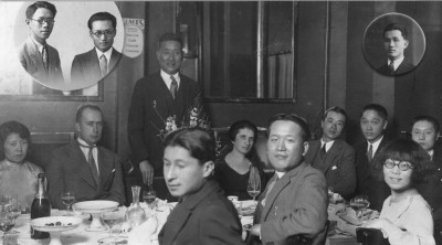 1929年7月,在巴黎某西餐館,站立者張伯苓,他右邊是華羅琛,左邊是法國漢學家Georges Margoulie,前排中間是少年華攬洪(華南圭夫婦之子,未來的建筑師),前排右一是南開校友周鐘錚,圓框中的三人是鏡頭沒能攝入的在座客人。