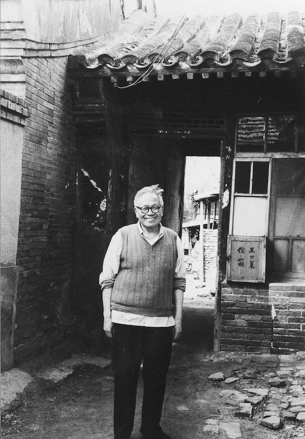 王世襄在芳嘉園后院門前,旁邊是他自制的信箱