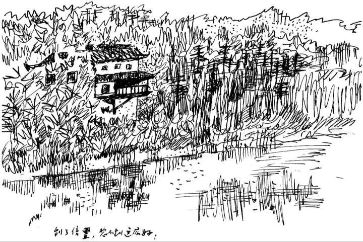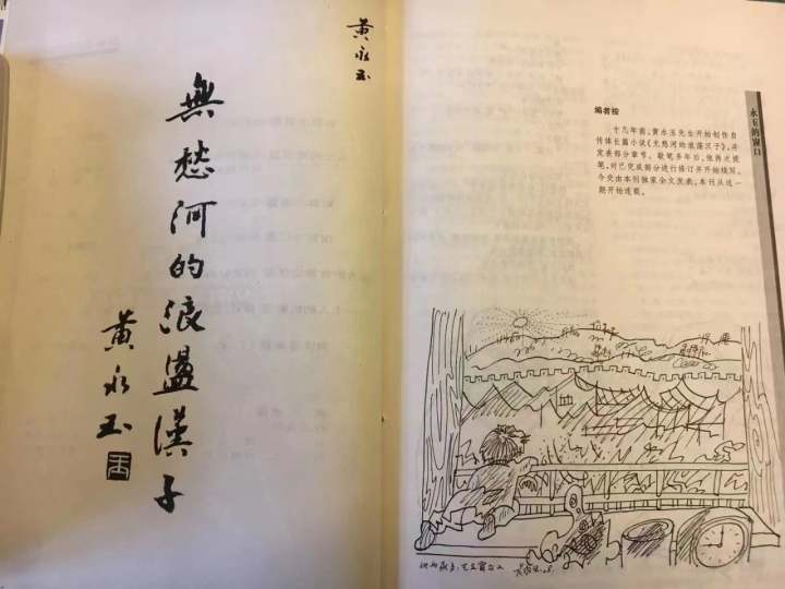 《無(wú)愁河的浪蕩漢子》2009年開始在《收獲》刊發(fā)。前面二十萬(wàn)字,是黃先生早已經(jīng)寫好的,曾經(jīng)在《芙蓉》上發(fā)表過(guò),為了這部作品的完整(當(dāng)時(shí)屬于正在展開),據(jù)說(shuō)也是為了激勵(lì)黃先生寫下去,李小林老師決定重新以連載的方式刊發(fā),黃先生為每期連載的內(nèi)容配插圖,插圖是新創(chuàng)作的。這部長(zhǎng)篇巨著的第一句話是:“他兩歲多,坐在窗臺(tái)上。”黃先生配的插圖是一個(gè)娃娃——也就是后來(lái)大名鼎鼎的序子——趴在窗臺(tái)上,雙手搭在欄桿上,正往外看。窗外有房子,有城墻,有山,有太陽(yáng)正放光芒。近景有一只座鐘,時(shí)針指在九點(diǎn)上,那序子看到的太陽(yáng)就是冉冉升起的太陽(yáng)了。小說(shuō)連載到2020年,最后一期寫的是走南闖北的序子闖蕩臺(tái)灣,遇到了險(xiǎn)情,結(jié)尾是這樣的: