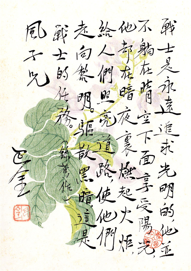 巴金手札,內(nèi)容是“戰(zhàn)士是永遠追求光明的,他并不躺在晴空下面享受陽光,他卻在暗夜里燃起火炬,給人們照亮道路,使他們走向黎明。驅(qū)散黑暗,這是戰(zhàn)士的任務(wù)?!?/span>