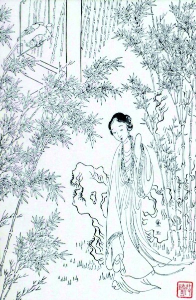 清代畫家改琦的《紅樓夢圖詠》則更加注重作品的繪畫性與意境美?!盀t湘清韻”與“竹林風(fēng)骨”使黛玉之美別具韻致,畫面中的林黛玉從瀟湘館竹徑中款款而來,一只手抬起,似拭淚之狀,另一只手隱在袖中,呈現(xiàn)弱柳扶風(fēng)之態(tài),背景竹石筆墨簡逸。從線的造型來看,改琦筆下的線條輕細(xì)、秀潤、圓渾,內(nèi)力充盈,如行云流水,在動靜結(jié)合之中生動表現(xiàn)了林黛玉沉湎于自身情緒而又潔身自好的性格特征。