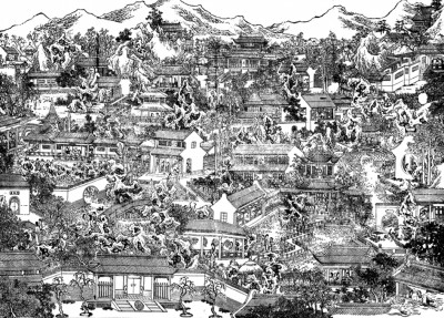國畫大家潘天壽曾言:“吾國繪畫,以筆線為間架,故以線為骨?!眰鹘y(tǒng)中國畫的白描技法以線造型,通過線條的輕重緩急、疏密聚散、頓挫剛?cè)?、濃淡干濕塑造空間物象,有著很強的表現(xiàn)力。在眾多版本的《紅樓夢》中,《增評補圖石頭記》影響較大。其中,《增評補圖石頭記》萬有文庫版中的《大觀園總圖》采用白描技法繪制,圖中景物細(xì)密、元素齊備。在空間布局上,畫家采用了并置手法,將大觀園以建筑或主題景觀分割成若干子畫面,每個子畫面配置主題人物,以“畫中畫”的形式呈現(xiàn)出大觀園的整體架構(gòu)及主要景觀。從建筑組合到院落圍墻,從石景溪水到林木花草,透過細(xì)膩的筆觸,觀者可以感受到豐富的園林意蘊。畫家對每一處庭院結(jié)構(gòu)的刻畫均力求精準(zhǔn),透露出深厚的繪畫功底與園林造詣。