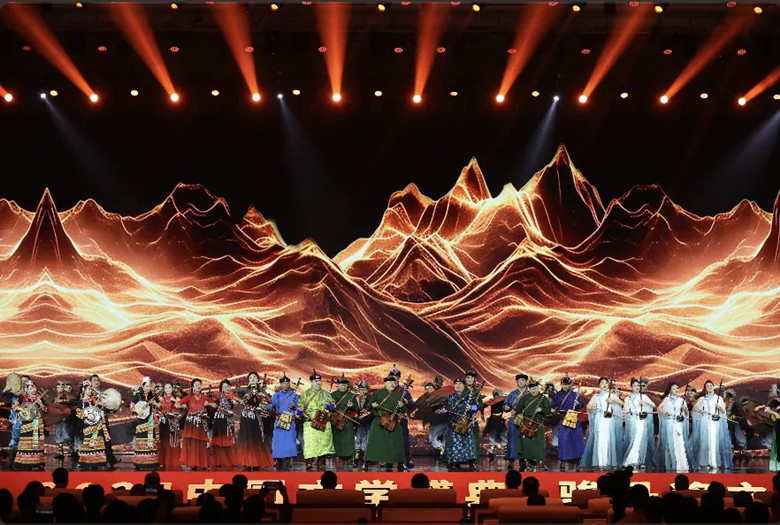 本次盛典將文學(xué)頒獎(jiǎng)典禮與舞臺(tái)表演相結(jié)合,在頒獎(jiǎng)中精心穿插豐富多樣的文藝表演,精選新中國成立以來的經(jīng)典歌曲、舞蹈、器樂作品進(jìn)行編排,藝術(shù)化地展現(xiàn)了新時(shí)代作家扎根人民、勇攀高峰的昂揚(yáng)面貌。器樂《萬馬奔騰》、舞蹈《銀落舞》、歌曲《光亮》、情景舞蹈《山鄉(xiāng)巨變看今朝》、歌曲《愛我中華》《多謝了》等節(jié)目民族特色鮮明、時(shí)代氣息濃郁,有力彰顯了中華民族多元一體、團(tuán)結(jié)統(tǒng)一的鮮明底色?,F(xiàn)場還播放了分別以凡一平、柳客行、艾布及上屆全國少數(shù)民族文學(xué)創(chuàng)作駿馬獎(jiǎng)獲得者紅日為主角的三個(gè)視頻短片,以影像的方式展現(xiàn)作家形象,深入挖掘獲獎(jiǎng)作家的心路歷程及其作品背后的感人故事。盛典還將莊重典雅的大型文學(xué)頒獎(jiǎng)典禮與氣氛熱烈、形態(tài)豐富、傳播力強(qiáng)的電視晚會(huì)和網(wǎng)絡(luò)平臺(tái)直播充分融合,面向全社會(huì)展現(xiàn)新時(shí)代民族文學(xué)欣欣向榮的發(fā)展態(tài)勢,最大程度拓展文學(xué)“朋友圈”,讓文學(xué)進(jìn)一步破圈跨界傳播。