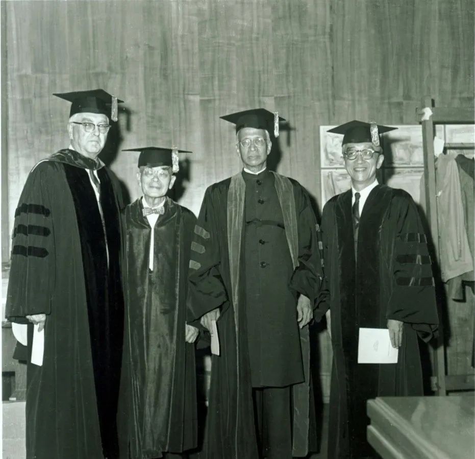 1959年第三屆“東西方哲學(xué)家會(huì)議”,胡適(右一)、鈴木大拙(左二)和拉達(dá)克里希南(右二)被夏威夷大學(xué)授予名譽(yù)博士學(xué)位