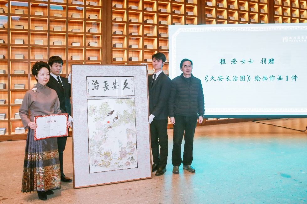 作為戴老的入室弟子,程澄將新近精心繪制的《久安長(zhǎng)治圖·白娘子》捐贈(zèng)予杭州國(guó)家版本館。圖中白娘子溫婉柔美,牡丹、桂花等名花異卉寓意富貴祥瑞、前程錦繡,九只鵪鶉則諧音“久安”,全圖充分表露出對(duì)于偉大祖國(guó)長(zhǎng)治久安、物阜民豐的美好期盼和溫馨禱祝,生動(dòng)展現(xiàn)出中國(guó)式現(xiàn)代化所呈現(xiàn)出的輝煌與璀璨。