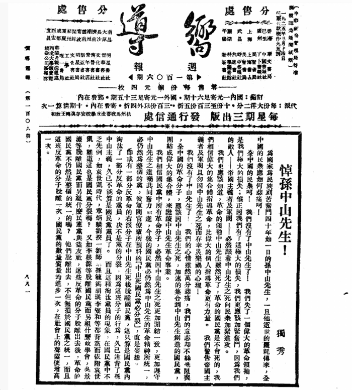 陳獨秀在《向?qū)А返?06期發(fā)表《悼孫中山先生!》一文