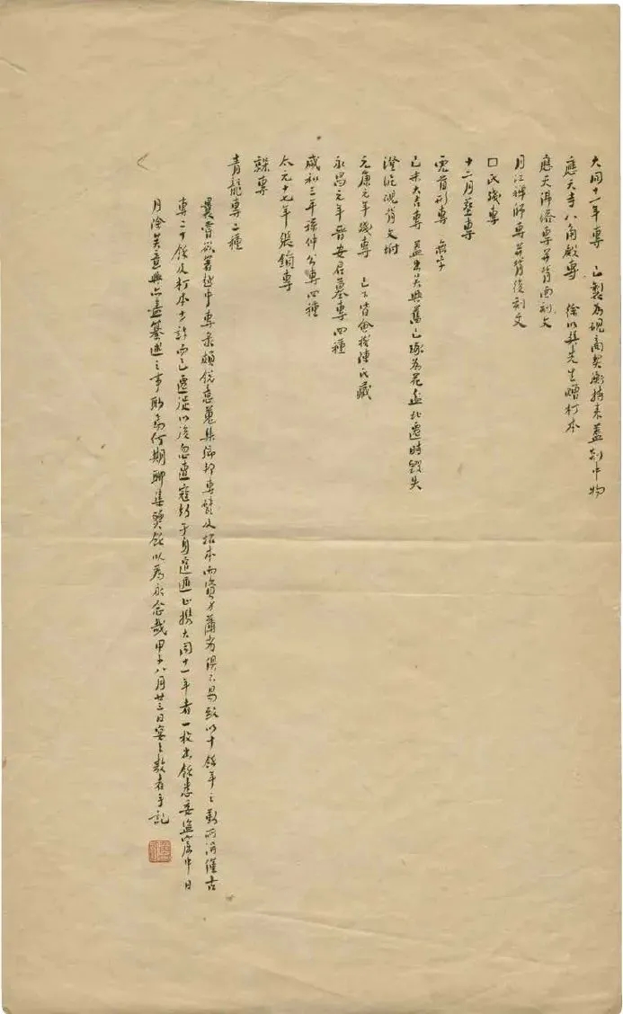 曩嘗欲著《越中專錄》,頗銳意蒐集鄉(xiāng)邦專甓及拓本,而資力薄劣,俱不易致。以十余年之勤,所得僅古專二十余及朾本少許而已。遷徙以后,忽遭寇劫,孑身逭遁,止攜大同十一年者一枚出,余悉委盜窟中。日月除矣,意興亦盡,纂述之事,渺焉何期?聊集燹余,以為永念哉!甲子八月廿三日,宴之敖者手記。[31]