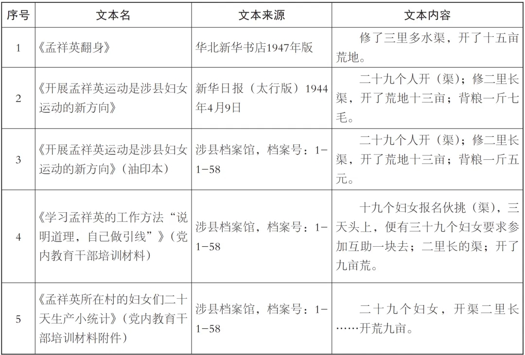 這份表格整理了涉及孟祥英與太倉村婦救主任之間交往的各類文本,包括文學作品、公開報道與政府文書,在文本生成時間序列上由近及遠,相互影響,在文本等級與流通范圍上由高到低、由廣到狹,在文本細節(jié)上,也表現(xiàn)出由略到詳?shù)奶攸c[35]。觀察表格,我們可以意識到:從數(shù)據(jù)上看,公開報道并不比文學作品來得精確,政府文書也并不比公開報道更權威。材料3是由涉縣建設科保存的報道油印件,剛好是公開報道材料2的“底本”,對比可知,公開報道對部分數(shù)據(jù)做了改動。材料5與材料4來源于同一份保存在涉縣檔案館的干部培訓材料,材料5作為材料4的附件出現(xiàn)。這意味著哪怕是兩份由相同筆跡抄寫、油印的材料,只因文件在形成時間與來源方面的差異,就提供了完全不同的數(shù)據(jù)。各類文本在數(shù)據(jù)層面的分歧清楚地向我們呈現(xiàn)出:在文本復制的過程中,數(shù)據(jù)往往并不穩(wěn)定,反倒是以婦救主任的轉變論證孟祥英工作方法之正確性的敘事模式得以毫無損耗地流傳下來。也就是說,與生產經驗相比,敘事模式反而是更值得繼承的面向。