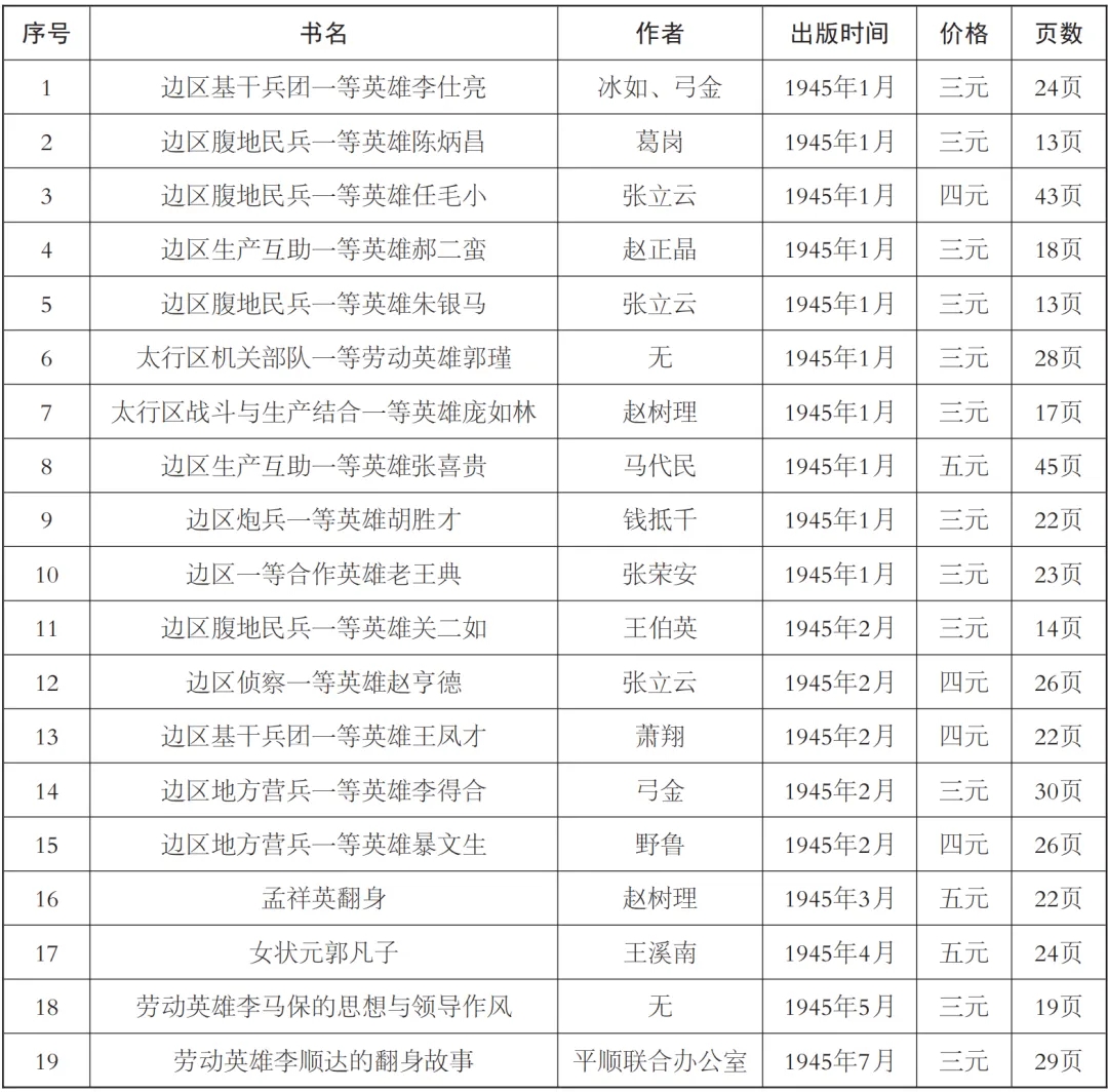 出版量從1944年的9萬冊驟然提高到1945年的45萬冊,依靠的正是這批“殺敵英雄、勞動英雄的故事以及由調查研究而寫出的文藝小冊(子)”。為了配合這一出版方面的轉向,太行區(qū)宣傳部還進行人員調整,將“書店與報社合并,文化事業(yè)委員會亦合并去報社,成為叢書編輯部”[45]。這里的“書店”就是指華北新華書店,“報社”即《新華日報》(太行版),這一合并形成的“叢書編輯部”,就是趙樹理的工作單位。此后,群眾/通俗讀物與干部讀物成為根據(jù)地出版工作的常用區(qū)分,1946年新成立的冀南書店就直接將編輯部分成干部讀物組和通俗讀物組,并規(guī)定“通俗讀物占全部出版物的三分之一”[46]——群眾讀物體系的建設無疑成為解放區(qū)出版工作的重要發(fā)展方向。