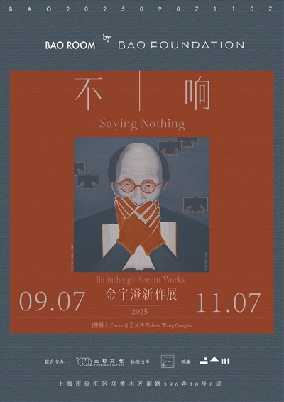 2025年9月,金宇澄在上海珍寶藝術(shù)基金會舉辦名為“不響”的畫展,畫展的海報用了和畫冊一樣的自畫像,畫中的金宇澄戴著紅框眼鏡和紅色手套,兩只手捂住了自己的嘴巴。這畫似乎將“不響”具象化了,帶著某種戲謔的態(tài)度。