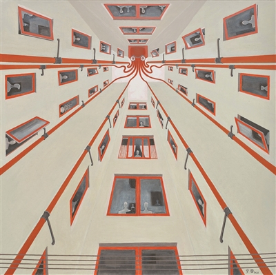 我覺得我畫畫還是興趣在推動,沒明確要在畫上完成什么,就是拿來就用。比如去年,我畫了一幅自畫像,這幅畫中還有一個十字形的建筑,我發(fā)現(xiàn)這個建筑的十字上,好像是章魚的觸角,這個觸角就是這幢建筑的排水管道,紅色的章魚在十字建筑一個個缺口往下看,八根觸須通向各家各戶……