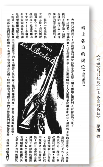 在籌備階段,茅盾因在文學(xué)界的崇高地位而備受《吶喊》籌備組眾人的信賴,主動(dòng)承擔(dān)了《吶喊》的早期主編工作和發(fā)起責(zé)任。在創(chuàng)刊號中,他發(fā)表了《站上各自的崗位》一文,疾呼:“大時(shí)代已經(jīng)到了!民族解放的神圣的戰(zhàn)爭要求每一個(gè)不愿做亡國奴的人貢獻(xiàn)他的力量?!痹谖恼轮兴麖?qiáng)調(diào),非常時(shí)期的文學(xué)工作者應(yīng)該承擔(dān)責(zé)任,保持沉著,他號召大家“站在各自的崗位上,做他應(yīng)做的而且能做的工作”??锔?,他又在《烽火》創(chuàng)刊號中用《戰(zhàn)神在嘆氣》一文,犀利抨擊日軍的狂妄與殘暴:“你不是說過么,滅亡你的鄰邦只要二十四小時(shí)?……原來你只會嚇一些軟骨頭的‘恐日病者’,你一向只會夸嘴!”以此表達(dá)對侵華日軍的憤怒與不屑。雖然茅盾先生后來因戰(zhàn)局惡化被迫離開上海,但他沒有放棄寫作,仍然堅(jiān)持向《烽火》寄回他在流轉(zhuǎn)途中創(chuàng)作的散文、短論及報(bào)告文學(xué),真實(shí)記錄戰(zhàn)爭苦難與民眾抗?fàn)帲瑸榭箲?zhàn)時(shí)期的文藝事業(yè)留下了一批珍貴文獻(xiàn)。