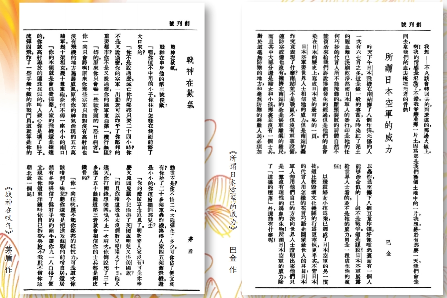 同樣不可忽視的是巴金在《烽火》出版過程中的關(guān)鍵作用。作為《吶喊》和《烽火》的聯(lián)合創(chuàng)刊人之一,巴金不僅全程參與了從《吶喊》到《烽火》的編輯出版工作,更是從《烽火》第六期開始接任了茅盾的主編任務(wù)。在戰(zhàn)火紛飛、出版條件極其困難的情況下,巴金始終堅(jiān)持組稿和撰寫文章,甚至為了確保了刊物的持續(xù)出版,他隨身攜帶未刊稿件,輾轉(zhuǎn)于中國南方地區(qū)躲避戰(zhàn)爭并隨時(shí)尋找機(jī)會進(jìn)行刊印。巴金的文學(xué)創(chuàng)作一直以直面現(xiàn)實(shí)、情感熾烈和附有批判性而著稱,在為刊物供稿的過程中,他將個(gè)人情感與民族命運(yùn)緊密結(jié)合,用文字向社會傳達(dá)了人民的處境和心聲。1937年8月28日,日軍轟炸上海南站,造成大量平民傷亡,巴金憤慨萬分,提筆撰寫了《所謂日本空軍的威力》一文發(fā)表在《烽火》上,嚴(yán)詞譴責(zé)日軍:“這不是戰(zhàn)爭,這是謀殺!日本空軍展露給世界人士看的,并不是它的威力,而是一種虐他性的瘋狂!”他將日軍稱為“一群沒有理性的渴血生物”,以此來表達(dá)他作為中國人的憤怒和作為一名作家的良知。據(jù)重慶師范大學(xué)統(tǒng)計(jì),巴金先后在《吶喊》與《烽火》上發(fā)表各類作品30余篇,體裁涵蓋雜文、小說、詩歌與譯作,是《吶喊》和《烽火》供稿最多、影響最大的核心作者之一。