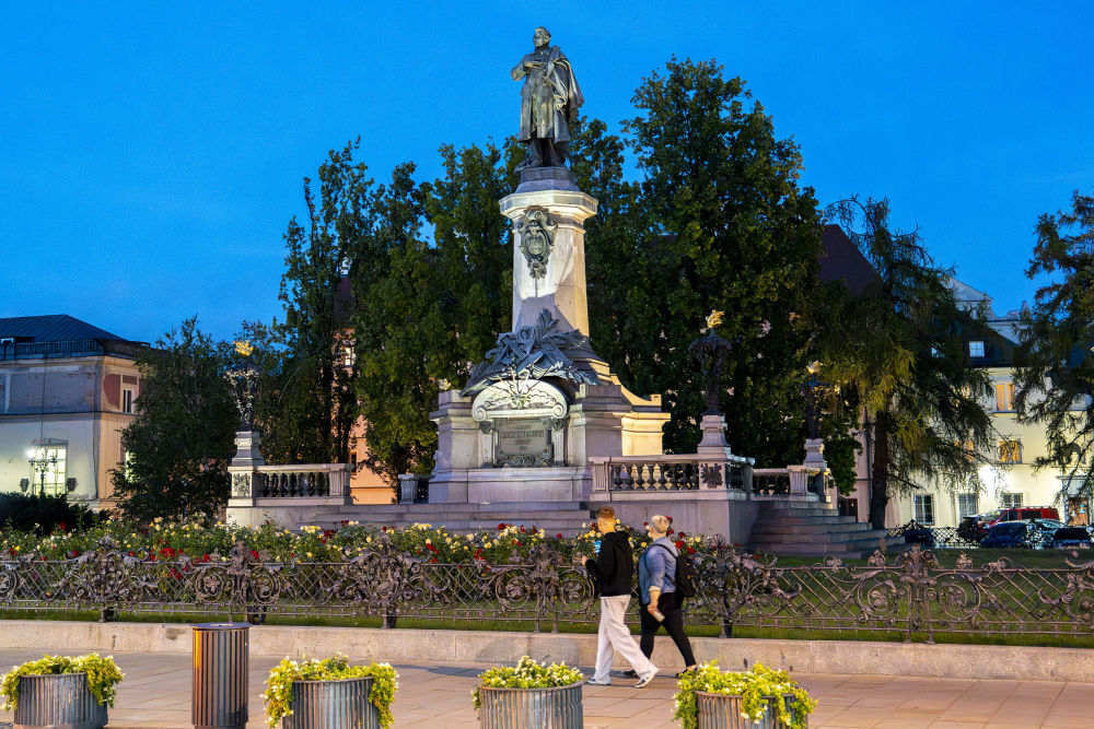 9月19日,在波蘭華沙街頭,路人經(jīng)過波蘭詩人亞當·密茨凱維奇紀念碑。 新華社記者 夏原一 攝