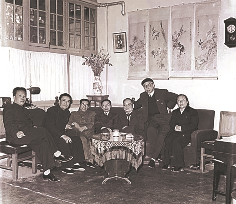 1960年,戲劇家們?cè)诒本堊灾衣窔W陽予倩家中,左起:陳白塵、陽翰笙、張庚、夏衍、歐陽予倩、田漢、李伯釗