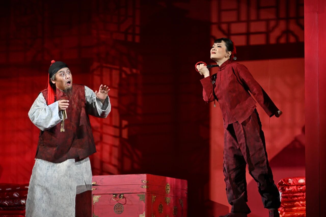 小說的線性敘事難以展現(xiàn)視覺與音樂切換所產(chǎn)生的巨大張力,而這正是歌劇藝術的魅力所在。在第二場中,一座精雕細琢的中式婚床成為舞臺核心,九兒身披紅嫁衣,靜坐于血色光影中,周遭的紅燈籠、錦緞鋪蓋,共同構筑起一個華麗而壓抑的封建牢籠。當患有肺癆的單扁郎踉蹌闖入,在婚床上展開一場追逐時,戲劇的荒誕感油然而生。他唱腔滑稽,強調(diào)“姻緣天定”;九兒的回擊則如驚雷,唱出“寧死不嫁漢奸”的決絕。二人風格迥異的唱段形成尖銳對抗:單扁郎的唱腔帶著俚俗的狡黠,九兒的反擊則如山崩地裂。于是,婚床化身“戲臺”,上演著一場被圍觀的儀式。這種“臺中臺”的嵌套設計,極大地濃縮了沖突,讓個體的反抗在與環(huán)境、命運的對抗中,迸發(fā)出悲劇性的崇高感。更加震撼人心的,是緊隨其后的場景切換:舞臺從壓抑可怖的婚床轉變?yōu)闊o邊的高粱地。余占鰲與九兒在此深情重唱,那簡單的問答“這里就是家”,與先前場面形成天壤之別。情感如野火般掙脫所有束縛,使這片高粱地化作一場對生命、自由與愛最直接、最熱烈的禮贊。