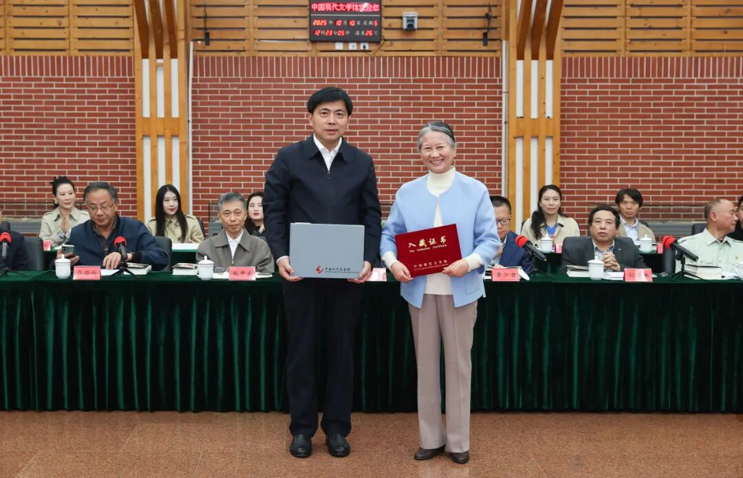 鄭蘇伊代表臧克家親屬向中國現(xiàn)代文學(xué)館捐贈了1000余件手稿、實物,368本名家簽名贈書等珍貴文獻。中國現(xiàn)代文學(xué)館常務(wù)副館長王軍接受捐贈,并頒發(fā)入藏證書