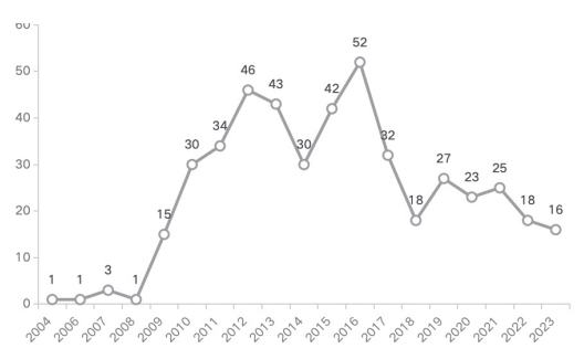 圖2:莫言作品的日本讀者評價(jià)數(shù)量趨勢(2008—2023)