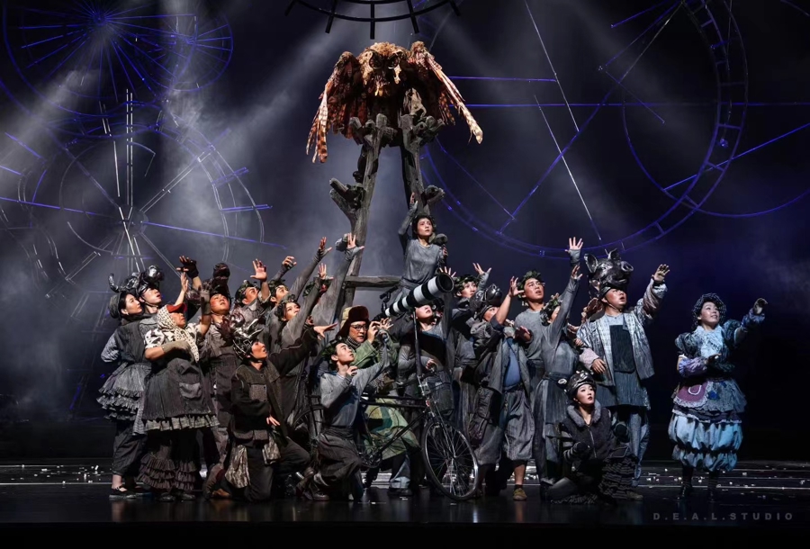 他們的創(chuàng)造是全方位的,編導(dǎo)演、舞美、音樂合流,每一個細(xì)部,都充滿了尋常意義上的不確定性。比如對星空的表現(xiàn),最后立到舞臺上的“布景”,竟然沒有一顆星星,全是鄉(xiāng)場上那些水磨、輪盤等農(nóng)具的“機(jī)械式”精密組裝。我立即表示認(rèn)同,這不正是對宇宙抽象、概括而本質(zhì)的理解嗎?浩瀚宇宙,不正是一個“萬有引力”的精密組合體嗎?另外就是觀測,觀測讓我們知道了星空。因此,觀測,才是藝術(shù)家們在戲里的著力點,星空就“留白”給想象力了。
