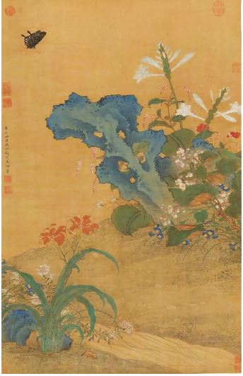 明代畫家文俶是著名畫家文徵明的玄孫女,她擅畫花卉蟲蝶,創(chuàng)作出諸多精美的花鳥畫作。她曾繪有一幅《秋花蛺蝶圖》,如今收藏于天津博物館,畫面中描繪了初秋之際花卉盛開,蝴蝶翻飛,流水潺潺的美麗景象。狹窄的溪流兩側(cè)鮮花盛開,色彩鮮艷,有藍(lán)色的雛菊、粉嫩的竹節(jié)海棠、橘色的萱草、白色的玉簪、粉白的紅蓼、艷紅的石竹以及其他諸種草花。挺拔嶙峋的太湖石立于花草之間,既豐富了畫面內(nèi)容,增添畫面層次,又調(diào)和了畫面色彩。畫面左上方,一只黑色蝴蝶被繁花吸引而來,正扇動翅膀,緩緩落下。畫家對花卉的刻畫十分精準(zhǔn),傳神勾勒出不同花卉的花朵形態(tài)。在刻畫萱草花朵時,畫家綜合運(yùn)用留白、勾線、暈染等多種手法,巧妙呈現(xiàn)出花瓣上的色彩變化和紋理結(jié)構(gòu),使筆下的花卉生動傳神,別具風(fēng)姿。