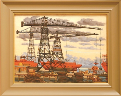 經(jīng)典作品《巨臂》就是一個(gè)典型例證。這件作品依據(jù)在大連造船廠的寫生資料創(chuàng)作。畫面描繪了三臺(tái)矗立于港口的起重機(jī),它們形態(tài)相同,卻因巧妙的布局在畫面中各具姿態(tài)。更為精妙的是,許幸之將色彩鮮艷的橙色大船置于起重機(jī)之后,并未展現(xiàn)全貌。常人或許不會(huì)以如此平視的角度刻畫這三臺(tái)起重機(jī),更不會(huì)想到將大船作為背景。而許幸之巧妙的構(gòu)圖視角,正是其創(chuàng)作的獨(dú)具匠心之處。