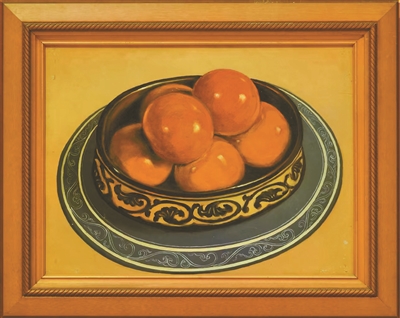許幸之的靜物畫偏愛描繪陶瓷與水果植物。他選擇陶瓷,不僅因?yàn)樗侵袊?guó)的象征,更因?yàn)樘沾稍诠饩€下所呈現(xiàn)的色澤,正是他在油畫語言中國(guó)化探索中亟欲解決的核心問題。陶瓷表面有釉,反光強(qiáng)烈,色澤又極為鮮艷,這種獨(dú)特質(zhì)感在光影中所形成的視覺感受,成為許幸之努力捕捉與表現(xiàn)的對(duì)象。對(duì)許幸之而言,若能以油畫的語言完美再現(xiàn)中國(guó)陶瓷的質(zhì)感色澤,將會(huì)是油畫在新中國(guó)語境下實(shí)現(xiàn)民族化的重要進(jìn)展。