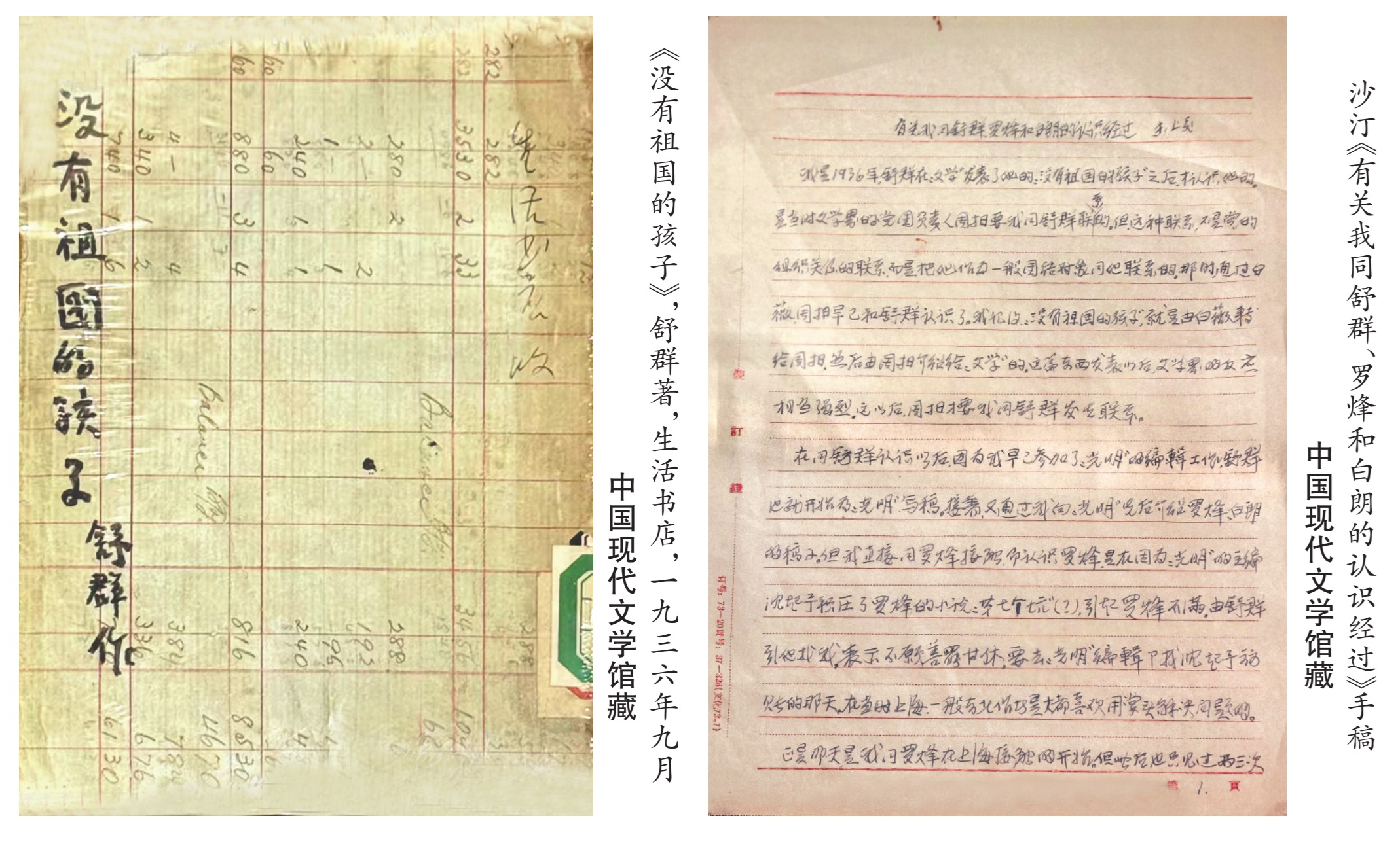 “我是1936年,舒群在《文學(xué)》發(fā)表了他的《沒有祖國的孩子》認(rèn)識(shí)他的……那時(shí),通過白薇,周揚(yáng)早已和舒群認(rèn)識(shí)了,我記得《沒有祖國的孩子》就是由白薇轉(zhuǎn)給周揚(yáng),然后由周揚(yáng)介紹給《文學(xué)》的。這篇東西發(fā)表以后,文學(xué)界反映相當(dāng)強(qiáng)烈?!痹谥袊F(xiàn)代文學(xué)館“山河跡憶——手稿里的抗戰(zhàn)中國”展覽中,展出了作家沙汀的手稿,真實(shí)地記錄了舒群和筆下的果里走上文壇的過程。