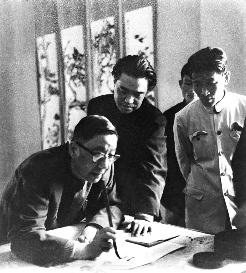 1962年4月,老舍在廣東參加潮劇座談會(huì)后為潮劇題詞。左二為陽(yáng)翰笙、右一為潮劇作曲家馬飛。