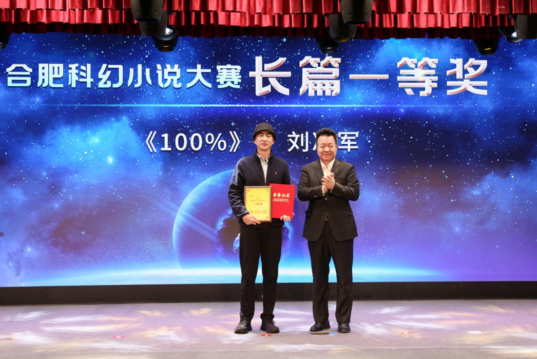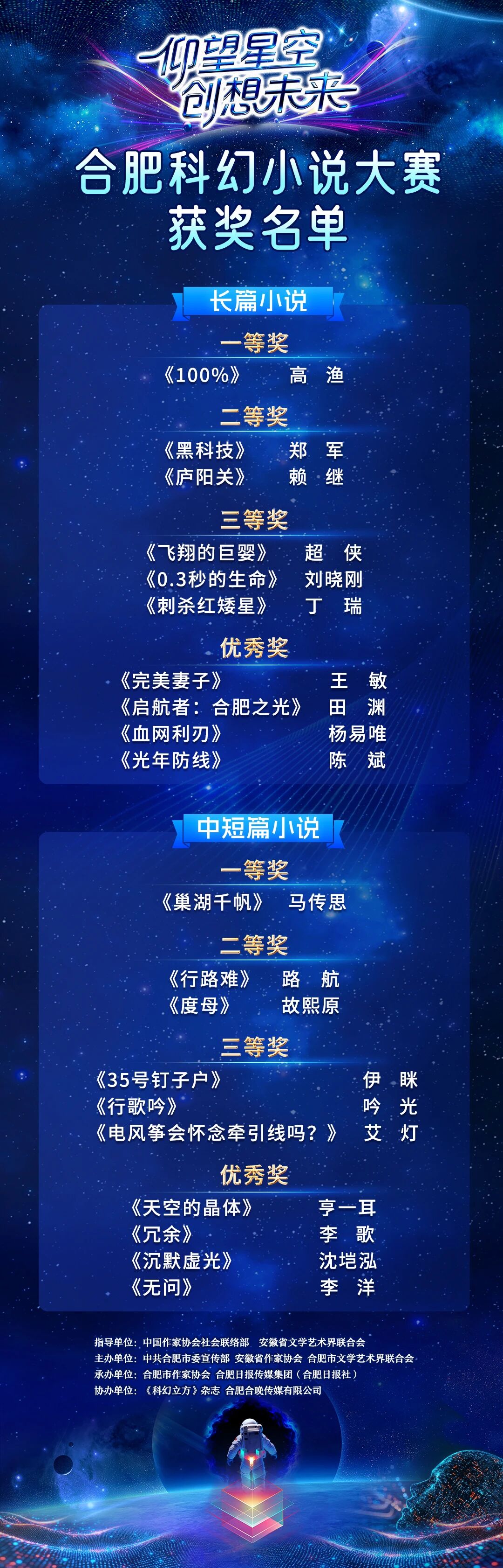 本次合肥科幻小說大賽以“仰望星空 創(chuàng)想未來”為主題,經(jīng)過近半年時間征集,收到投稿作品1349部,共8000余萬字,無論是參賽人數(shù),作品質(zhì)量,參選范圍,都遠(yuǎn)超預(yù)期,內(nèi)容涉及到星際探索、時空穿越、科技倫理、未來社會等多個科幻維度,通過層層篩選,嚴(yán)格評審,最終20部佳作脫穎而出。其中劉涼軍(高漁)的《100%》榮獲長篇小說一等獎;鄭軍《黑科技》、賴?yán)^《廬陽關(guān)》榮獲長篇小說二等獎;超俠《飛翔的巨嬰》、劉曉剛《0.3秒的生命》、丁瑞《刺殺紅矮星》榮獲長篇小說三等獎;王敏《完美妻子》、田淵《啟航者:合肥之光》、楊易唯《血網(wǎng)利刃》、陳斌《光年防線》獲長篇小說優(yōu)秀獎;馬傳思《巢湖千帆》榮獲中短篇小說一等獎,路航《行路難》、故熙原《度母》獲中短篇小說二等獎;伊瞇《35號釘子戶》、吟光《行歌吟》、艾燈《電風(fēng)箏會懷念牽引線嗎?》獲中短篇小說三等獎;亨一耳《天空的晶體》、李歌《冗余》、沈塏泓《沉默虛光》、李洋《無問》獲中短篇小說優(yōu)秀獎。