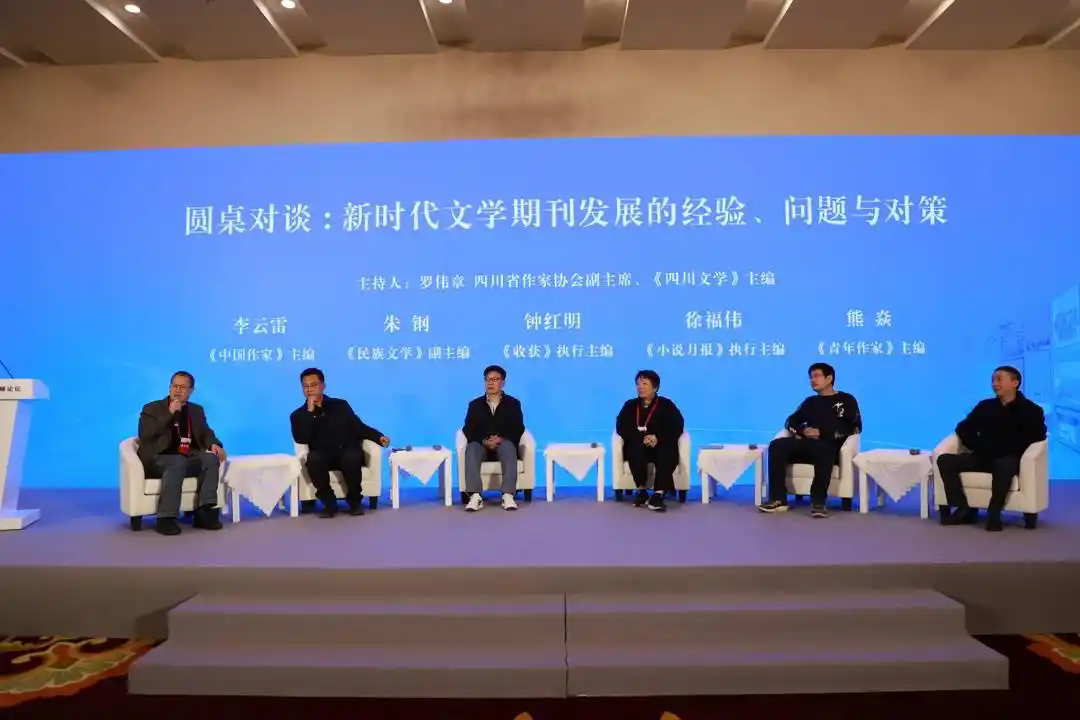 在由《四川文學(xué)》主編羅偉章主持的圓桌討論中,《中國作家》主編李云雷、《民族文學(xué)》副主編朱鋼、《收獲》執(zhí)行主編鐘紅明、《小說月報(bào)》執(zhí)行主編徐福偉、《青年作家》主編熊焱,就“新時(shí)代文學(xué)期刊發(fā)展的經(jīng)驗(yàn)、問題與對(duì)策”展開深入對(duì)話。與會(huì)嘉賓結(jié)合辦刊實(shí)踐,分析當(dāng)前文學(xué)期刊發(fā)展中的難點(diǎn)與機(jī)遇,總結(jié)創(chuàng)新經(jīng)驗(yàn),共同探索高質(zhì)量發(fā)展路徑。其中李云雷在討論中特別提及新大眾文藝、素人寫作等前沿議題。