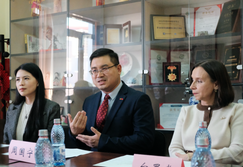 中國(guó)駐羅馬尼亞使館教育事務(wù)專員周國(guó)寧致辭。布加勒斯特大學(xué)孔子學(xué)院供圖