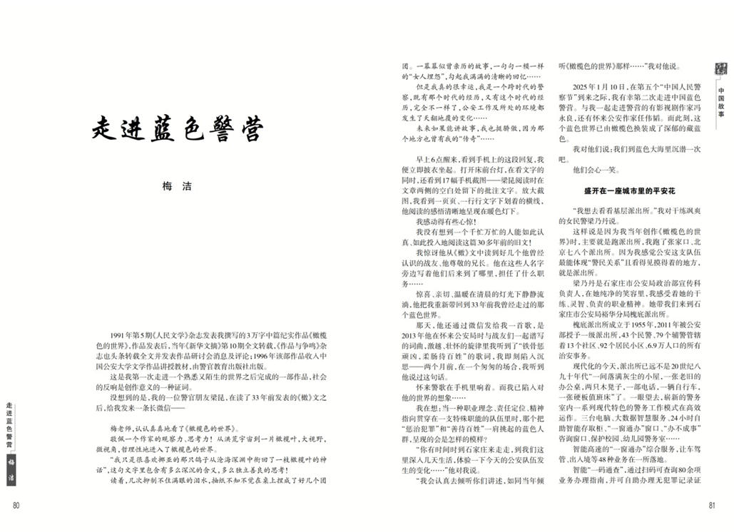 《走進(jìn)藍(lán)色警營(yíng)》是梅潔最新創(chuàng)作的一篇報(bào)告文學(xué)作品,發(fā)表于2025年第10期《中國(guó)作家》紀(jì)實(shí)版。在僅3萬(wàn)字的篇幅中,作者用細(xì)膩的筆觸、豐沛的情感、宏闊的視野,不僅對(duì)河北省石家莊市公安局現(xiàn)代化進(jìn)程進(jìn)行了全景式記錄,更是對(duì)新時(shí)代人民警察精神圖譜的深情描繪。作品通過(guò)大量鮮活生動(dòng)的細(xì)節(jié)描寫、典型人物的刻畫與典型事件的敘述,體現(xiàn)了“科技興警”的時(shí)代主題,弘揚(yáng)了“人民公安為人民”的初心,其中對(duì)基層民警個(gè)體命運(yùn)與精神的細(xì)膩刻畫,尤其是對(duì)呂建江、王永輝、謝宏偉、張文中、李永普等人物的描寫充滿敬意與感情,是英雄主義的謳歌,也是對(duì)普通人堅(jiān)韌與奉獻(xiàn)的禮贊。作品真實(shí)記錄了新時(shí)代人民警察的忠誠(chéng)與擔(dān)當(dāng),書寫了警民之間的深情與信任,內(nèi)容厚重、情感真摯,具有強(qiáng)烈現(xiàn)實(shí)意義和文學(xué)價(jià)值。